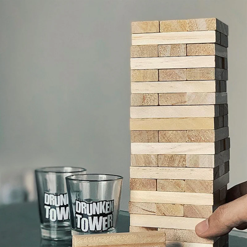 Skakiga händer och skoj i mängder! Drunken Tower är ett klassiskt dryckesspel där både skicklighet och nerver sätts på prov. Men se upp – vissa klossar har dolda utmaningar som snabbt kan få festen att snurra!
