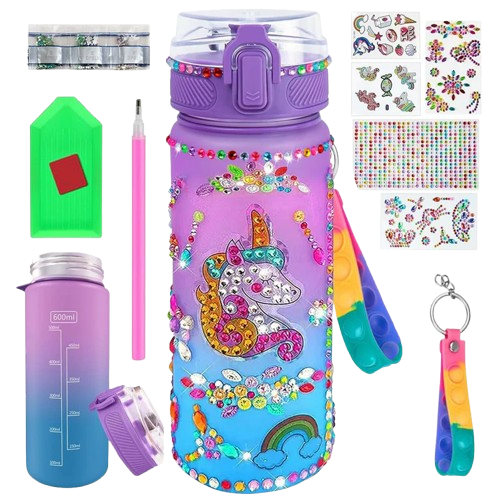 Flaskan rymmer 600 ml och är perfekt för att hålla sig återfuktad under hela dagen. Medföljande klistermärken, strass och diamantdekorationer gör flaskan till ett unika DIY-projekt där varje barn kan skapa sin egen drömflaska. Flaskan är tillverkad i BPA-fritt material och är säker för barn att använda (dock ej för diskmaskin).